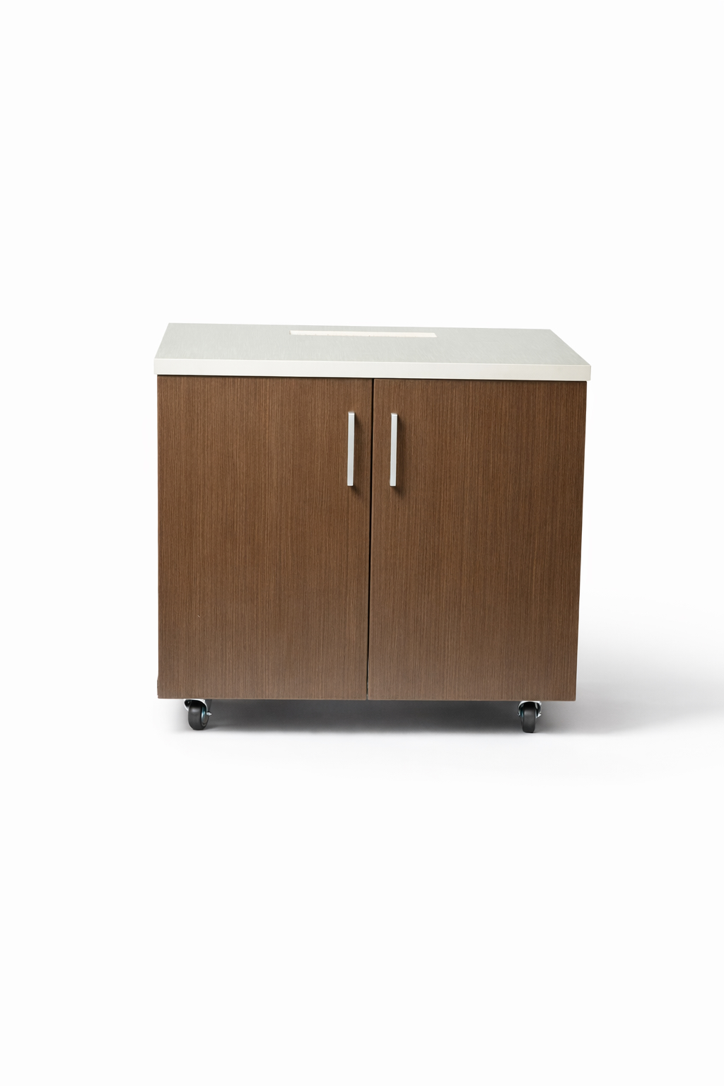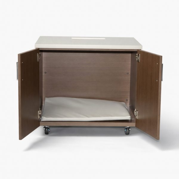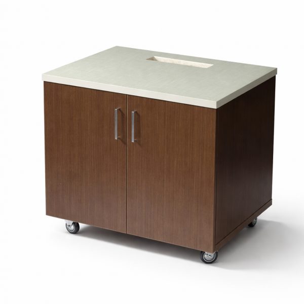 Solid cupboard with two doors, top opening for books, and casters.