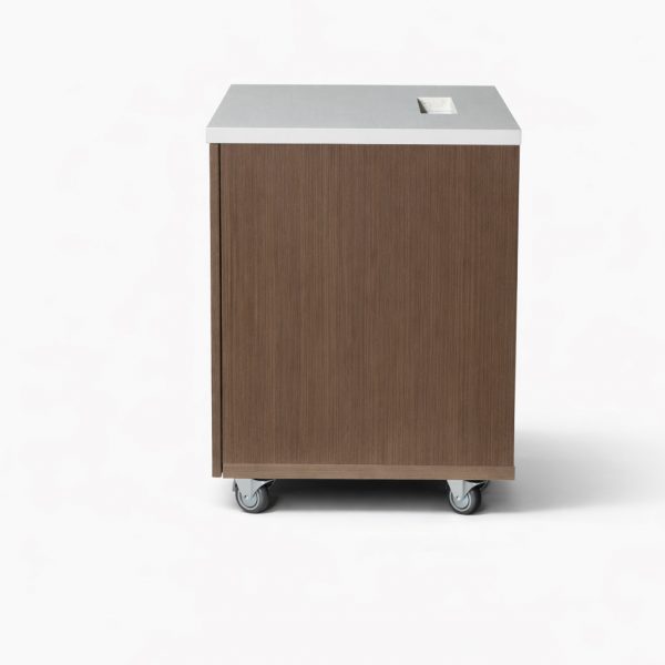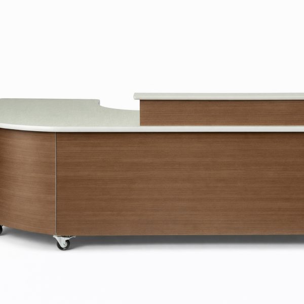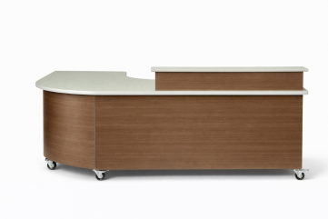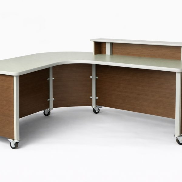 Perfect Media Center desk with plenty of surface area for the librarian, and functional transaction counter. Built with high quality laminate top and sides, fully unitized steel frame, and heavy-duty locking casters for mobility.