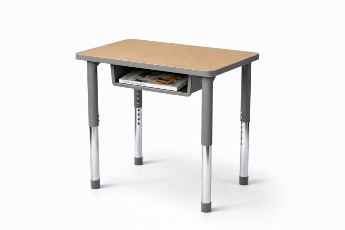 Futuristic, interlocking leg supports rise to a 500+ square inch desktop, with room for books and laptop. The Illustration V2 desk is height-adjustable, with a wide frame design that offers extra leg room in any grade. Optional casters, glides, bookbox, modesty panel and backpack hook.